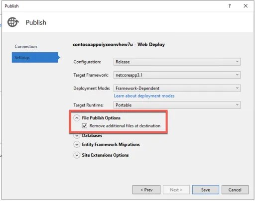 Here, we have mentioned how you can enable Remove additional files at destination settings in visual studio web deploy:
